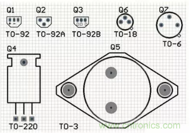 普通三極管的原理圖符號(hào)為NPN或PNP,常見的三極管封裝為“TO-92B”,而大功率三極管可用“TO-220”、“TO-3”等元器件封裝。