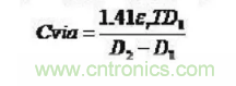 從等效電路模型可知,過(guò)孔本身存在對(duì)地的寄生電容,假設(shè)過(guò)孔反焊盤直徑為D2,過(guò)孔焊盤的直徑為D1,PCB板的厚度為T,板基材介電常數(shù)為ε,則過(guò)孔的寄生電容大小近似于: