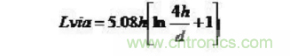 它的寄生串聯(lián)電感會(huì)削弱旁路電容的貢獻(xiàn),從而減弱整個(gè)電源系統(tǒng)的濾波效用。假設(shè)L為過(guò)孔的電感,h為過(guò)孔的長(zhǎng)度,d為中心鉆孔的直徑。過(guò)孔近似的寄生電感大小近似于:
