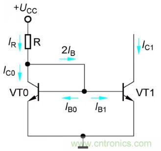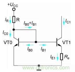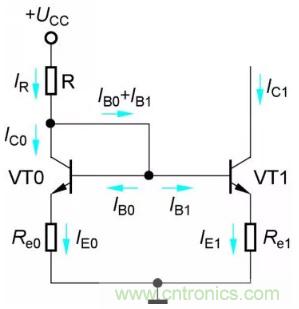 與典型的靜態(tài)工作點穩(wěn)定電路一樣,Re0和Re1是電流負(fù)反饋電阻,因此與鏡像恒流源電路相比,比例恒流源的輸出電流IC1具有更高的穩(wěn)定性。
