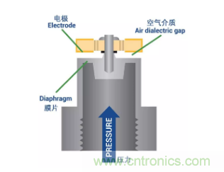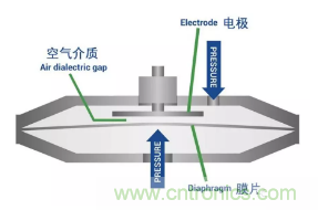 簡單地說,這些壓力傳感器是一種電容器,一種具有充電能力的裝置。當壓力作用到傳感器內部的膜片上時,膜片就會收縮,或向固定電極彎曲,并改變電容。這種物理變化會導致電子輸出的變化,該裝置可將壓力讀數(shù)轉換成電流或電壓值。