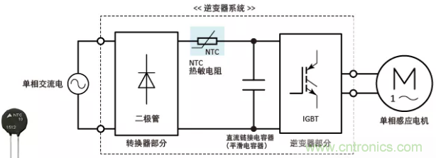 逆變器系統(tǒng)主要由轉(zhuǎn)換器級、逆變器級和直流側(cè)電容(平滑電容)組成,該電容放置在轉(zhuǎn)換器級之后,如下所示。上電時,器件會通過沖擊電流進行充電,而該沖擊電流的峰值是(為直流側(cè)電容充電的)穩(wěn)定電流的若干倍。該沖擊電流可能會對直流電容的使用壽命產(chǎn)生不利影響,或損壞半導(dǎo)體器件。為了防止沖擊電流,我們需要連接NTC熱敏電阻。