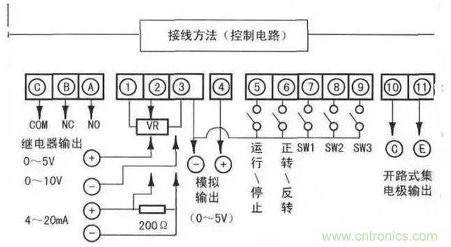 2、由于控制電路的頻率輸入信號是微小電流,所以在接點輸入的場合,為了防止接觸不良,微小信號接點應使用兩個并聯的節(jié)點或使用雙生接點。