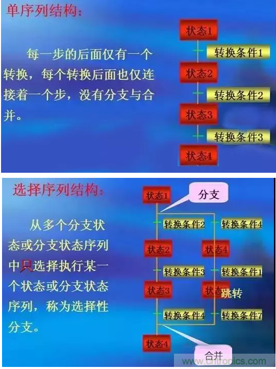 選擇序列的開(kāi)始稱為分支,轉(zhuǎn)換符號(hào)只能標(biāo)在水平線之下,每個(gè)分支上必須具有一個(gè)或一個(gè)以上的轉(zhuǎn)換條件,且具有優(yōu)先級(jí)。