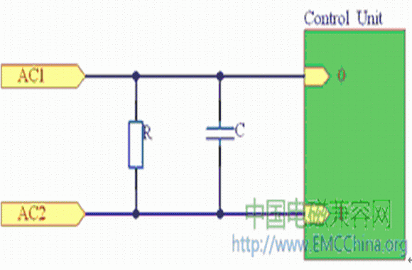 為了防止控制板電路產(chǎn)生的傳導(dǎo)干擾,可在電路的進(jìn)入口(即AC兩端)并接上一個(gè)電容C,圖1所示是一個(gè)簡(jiǎn)單的電容抗擾電路連接圖。圖中的電容屬于安全電容,但必須在該電容的兩端并聯(lián)一個(gè)安全電阻,以防止電源線拔插時(shí)電源線插頭長(zhǎng)時(shí)間帶電。因?yàn)榘踩珮?biāo)準(zhǔn)規(guī)定,當(dāng)正在工作之中的機(jī)器電源線被拔掉時(shí),在兩秒鐘內(nèi),電源線插頭兩端所帶的電壓(或?qū)Φ仉娢?應(yīng)小于原來(lái)電壓的30%。