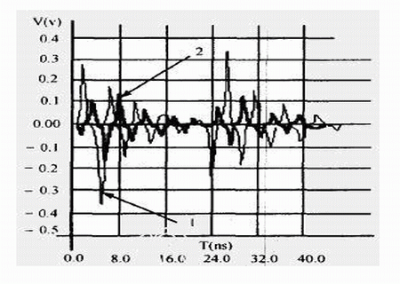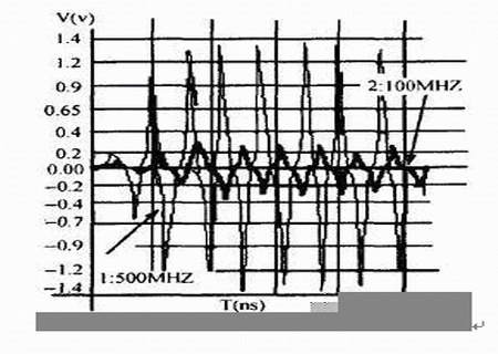 干擾源信號頻率越高,被干擾對象上的串?dāng)_幅值越大,我們對圖1中干擾源網(wǎng)絡(luò)AB上的信號頻率f1分別取不同頻率值時,對被干擾對象上的串?dāng)_進(jìn)行了仿真,仿真結(jié)果見表2,信號頻率不同時的串?dāng)_波形見圖5,標(biāo)記為“1”、“2”箭頭所指的波形頻率分別為“500MHz”、“100MHz”。