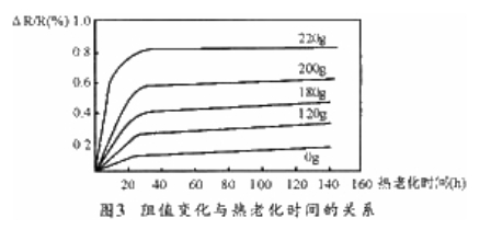圖3所示為卡瑪線在不同拉力下繞制后,在190℃溫度熱老化過程中阻值隨時間的變化曲線。拉力越大,阻值在熱老化時的變化也越大,這說明熱處理是消除應(yīng)力影響的有效措施。