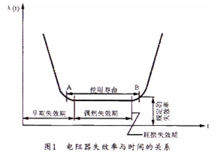 電阻器產(chǎn)品在正常條件下使用的失效可分為三種類型,即早期失效、偶然失效和耗損失效。圖1所示是電阻器失效率與時間的關(guān)系曲線。從曲線上可看出三種失效的三個階段。由于偶然失效出現(xiàn)在產(chǎn)品可靠工作的時期,研究這一時期的失效因素有重要意義。要提高產(chǎn)品的可靠性,必須加強產(chǎn)品對各種"應(yīng)力"所能耐受的強度。這里所謂的"應(yīng)力"是指對產(chǎn)品功能有影響的各種因素,如溫度、電壓電流、機械力等。