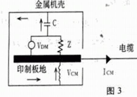 例2:印制電路板的地通過接地導(dǎo)線與機殼相連,如圖3所示。印制板上有信號線與機殼貼近,于是差模源VDM通過分布電容C耦合到機殼上,引起差模電流,該電流通過機殼和接地線又回到印制板的差模源。如果接地線存在一定的電感L,則差模電流在L上產(chǎn)生電壓降VCM,成為共模驅(qū)動電壓,從而引起共模輻射。這時天線的一部分是外接地線,另一部分是機殼。這種輻射常發(fā)生在以下情況,例如設(shè)備內(nèi)部的地址線、數(shù)據(jù)線等扁平電纜貼近機殼,分布電容較大,印制板和機殼之間的連接線細長或接觸不良等等。