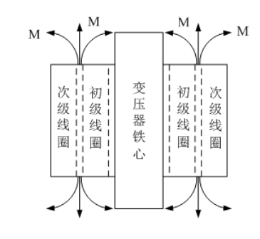 圖9是開關(guān)電源變壓器產(chǎn)生的漏磁通的原理圖。開關(guān)電源變壓器的漏磁通大約在5%~20%之間,反激式開關(guān)電源變壓器為了防止磁飽和,在磁回路中一般都留有氣隙,因此漏磁通比較大,即:漏感比較大。因此,產(chǎn)生漏感干擾也特別嚴(yán)重,在實(shí)際應(yīng)用中,一定要用銅箔片在變壓器外圍進(jìn)行磁屏蔽。從原理上來說,銅箔片不是導(dǎo)磁材料,對(duì)漏磁通是起不到直接屏蔽作用的,但銅箔片是良導(dǎo)體,交變漏磁通穿過銅箔片的時(shí)候會(huì)產(chǎn)生渦流,渦流產(chǎn)生的磁場(chǎng)方向正好與漏磁通的方向相反,是部分漏磁通被抵消,因此,銅箔片也可以起到磁屏蔽的作用。
