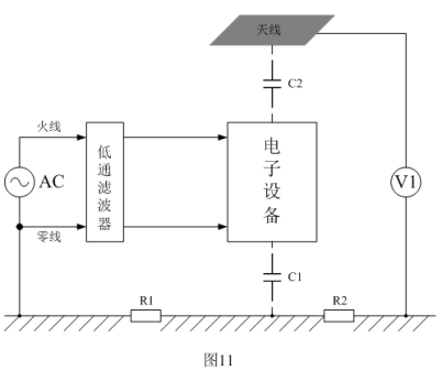 輻射干擾一般是通過電磁感應(yīng)的形式在空間進(jìn)行傳播的,圖11是測(cè)試電子設(shè)備產(chǎn)生輻射干擾的基本方法,或表示電子設(shè)備產(chǎn)生的干擾信號(hào)通過電磁感應(yīng)向空中輻射的原理。圖11中,電子設(shè)備表示干擾信號(hào)源,V1表示測(cè)量?jī)x表,C1表示電子設(shè)備對(duì)大地的電容,C2表示電子設(shè)備與天線偶合的電容,即:電子設(shè)備通過電場(chǎng)對(duì)天線產(chǎn)生感應(yīng),這里的天線也可以看成是被干擾的設(shè)備。圖11的測(cè)試方法就是測(cè)試電子設(shè)備周圍規(guī)定距離某處的電磁場(chǎng)強(qiáng)度,由于干擾信號(hào)一般都是一個(gè)頻率成份非常豐富的非正弦波,因此,無法對(duì)它進(jìn)行直接測(cè)量,只能對(duì)它其中某一個(gè)頻率信號(hào)單獨(dú)進(jìn)行測(cè)量。