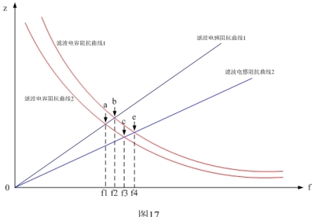 圖16表示C5電容與L0、L1、L2等電感濾波器的頻率-阻抗特性圖。圖16中紅線表示設(shè)備對地電容C5的頻率阻抗曲線;藍(lán)線是濾波電感L0、L1、L2的頻率阻抗曲線。