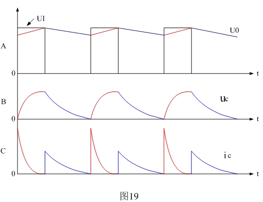 圖19是開(kāi)關(guān)電源整流輸出電壓以及電源濾波電容的紋波電壓和紋波電流波形。圖19中紅線(xiàn)表示電容器充電時(shí)的電壓、電流變化曲線(xiàn),藍(lán)線(xiàn)表示電容器放電時(shí)的電壓、電流變化曲線(xiàn)。其中Ui表示整流輸出電壓,Uo表示經(jīng)過(guò)濾波后的輸出電壓,uc表示濾波電容的紋波電壓,ic表示濾波電容的紋波電流。