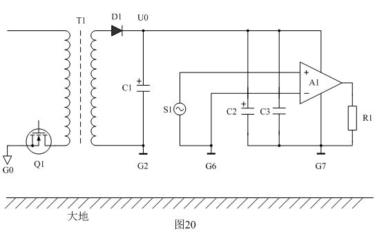 下面我們以圖18為例來(lái)分析地線(xiàn)對(duì)EMC產(chǎn)生的影響。圖18中Q1表示開(kāi)關(guān)電源,T1為開(kāi)關(guān)變壓器,D1為整流二極管,C1、C2、C3為濾波電容器,A1為功率放大器,S1為功率放大器輸入信號(hào),R1為功率放大器輸出負(fù)載,G1、G2、G3、G4、G5、G6、G7、G8為各個(gè)器件的地;Ui表示整流輸出電壓,Uo表示經(jīng)過(guò)濾波后的輸出電壓。