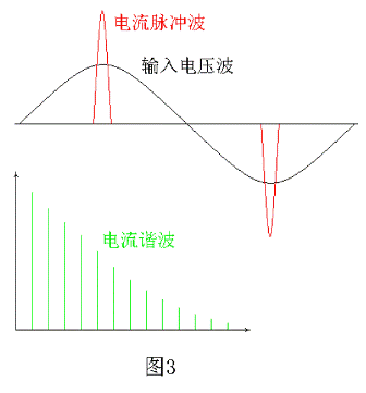 一般電容器C5 的容量很大,其兩端電壓紋波很小,大約只有輸入電壓的10%左右,而僅當輸入電壓Ui大于電容器C5 兩端電壓的時候,整流二極管才導通,因此在輸入電壓的一個周期內(nèi),整流二極管的導通時間很短,即導通角很小。這樣整流電路中將出現(xiàn)脈沖尖峰電流,如圖3 所示。