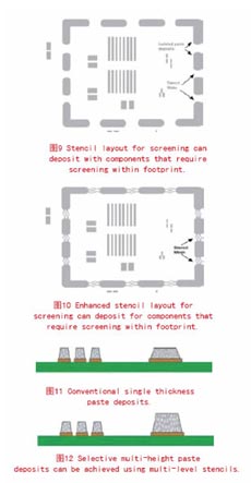 克服任何共面問(wèn)題的另一手段是采用厚度經(jīng)過(guò)選擇的印刷焊膏。在一個(gè)印刷通帶,為屏蔽腔選用增厚的焊膏和其他更大的元件,有助于消除元件共面的相關(guān)問(wèn)題。這種技術(shù)提供了更結(jié)實(shí)的焊帶,增加了機(jī)械強(qiáng)度,有助于防止填料浮空的相關(guān)問(wèn)題。