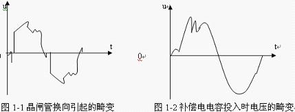 1)晶體管換流設(shè)備對(duì)變頻器的干擾:當(dāng)供電網(wǎng)絡(luò)內(nèi)有容量較大的晶閘管換流設(shè)備時(shí),由于晶閘管總是在每相半周期內(nèi)的部分時(shí)間導(dǎo)通,容易使網(wǎng)絡(luò)電壓出現(xiàn)凹凸(如圖1-1所示)。它使變頻器輸入側(cè)的整流電路有可能因此出現(xiàn)較大的反向回復(fù)電壓而受到損害。