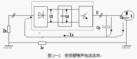 寄生電容Cp存在于電機(jī)電纜和電機(jī)內(nèi)部,因此變頻器的PWM輸出電壓波形的開關(guān)翼部通過寄生電容產(chǎn)生一個(gè)高頻脈沖電流Is,使變頻器成為一個(gè)諧波干擾源。由于諧波電流Is的產(chǎn)生源是變頻器,因此它一定要流回變頻器。圖中Ze為大地阻抗,Zn為動(dòng)力電纜與地之間的阻抗。諧波電流流過此二阻抗所造成的電壓降,將影響到同一電網(wǎng)上的其它設(shè)備造成干擾。[page]
