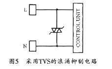 防止浪涌干擾的常用器件有氣體放電管、金屬氧化物壓敏電阻(MOVS)和硅瞬變吸收二級(jí)管(TVS)。圖5所示是采用TVS的浪涌抑制電路。