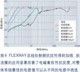 物理層應(yīng)用指南明確指出了對FlexRay網(wǎng)絡(luò)數(shù)據(jù)線扼流圈的總體要求,比如引線電阻(<1W)、電感(>50mH)以及雜散電感(<1mH)。對電磁輻射和電磁干擾的測定與CAN總線一樣。不過,由于10Mbit/s的更高傳輸率,需要更加仔細(xì)地檢查信號(hào)完整性。圖4所示為對具有各種電感的扼流圈與不使用扼流圈的測試板進(jìn)行DPI測定的相應(yīng)評估結(jié)果。圖五所示為使用另一塊測試板進(jìn)行電磁干擾測量的結(jié)果,同樣是針對具有不同電感的扼流圈。很明顯可以發(fā)現(xiàn),數(shù)據(jù)線扼流圈的使用改善了電磁兼容性并減少了干擾輻射。當(dāng)電感更高時(shí),作用就更大。不過,更高的電感值會(huì)對信號(hào)完整性產(chǎn)生一定的負(fù)面影響。[page]