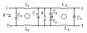 圖2為高性能的EMI濾波器。其中,E表示共模信號(hào)輸入端。圖2中網(wǎng)絡(luò)的共模等效電路如圖3(a)所示,差模等效電路如圖3(b)所示。圖3(b)中Le1、Le2、Cxi,i=1,2,3,分別表示等效電感和電容。