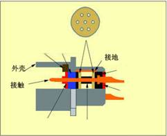 多層平面陣列是一種特定的用于EMI濾波連接器的元件設(shè)計形式。一個陶瓷塊內(nèi)包含有多種電容器。單個接線都是通過通孔連接到每個電容器,并且在器件范圍內(nèi)都連接到地。當信號沿多條路徑到地時表現(xiàn)出非常低的阻抗(圖3)。連接器的每一個接頭連接到一個或多個陣列內(nèi)的孔上。在每一個孔里有一個電容器——‘熱電極’與周圍的整體連接起來,地面電極覆蓋整個平面并且和連接器外殼通過平面周邊連接起來(圖4)。