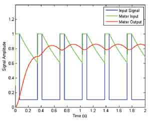 為幫助查看準峰值檢波器與相關(guān)儀表組合的響應(yīng),圖2把輸入響應(yīng)(重復(fù)脈沖,用藍色表示)、得到的準峰值檢波器響應(yīng)(具有響應(yīng)快、衰減慢的特點,用綠色表示)及檢波器與儀表的綜合響應(yīng)(用紅色表示)分開。