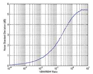 圖5 VBW/RBW之比對隨機噪聲信號標準偏差的影響。在VBW不小于3倍的分辨率帶寬時,其對VBW的信號偏差沒有實際影響