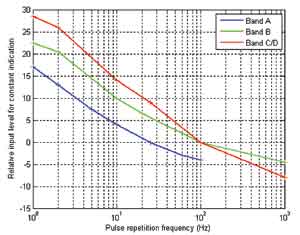 對于帶有QP檢波器的接收機上的常數(shù)指標,圖3表明了CISPR 16-1-1標準描述的幅度和重復(fù)頻率之間的關(guān)系。