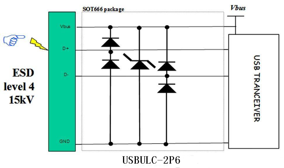 除保護兩條數(shù)據(jù)線路外,還必須保護Vbus線路。這是這個特殊的保護器件的另一個增值之處,因為它保護D+、D-和Vbus三條線路。專用的TVS二極管在相同的條件下像保護數(shù)據(jù)線路一樣保護Vbus線路,防護ESD浪涌。