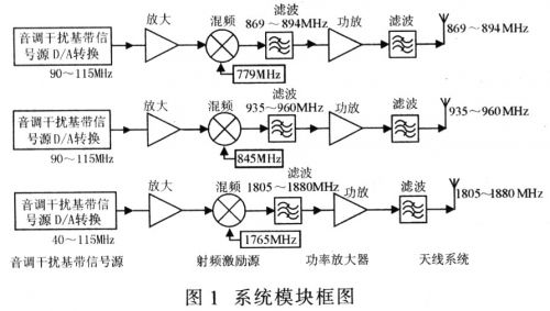 當(dāng)前通信制式下,基于FDMA/TDMA體制的GSM手機(jī)和基于CDMA體制的CDMA手機(jī)均是通過接收基站發(fā)射的某一頻率的電平信號實現(xiàn)通信。因此每一個手機(jī)接收機(jī)都有一個抗干擾容限,只要干擾信號與干擾目標(biāo)使用相同頻率且信號電平超過接收機(jī)的抗干擾容限,就使通信不能進(jìn)行,從而實現(xiàn)通信干擾。