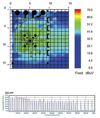該公司期望用令人信服的量化證據(jù)來向汽車廠商說明SSCG功能可以有效降低EMI輻射。為了實現(xiàn)這個目標(biāo),設(shè)計團隊首先在SSCG功能為“關(guān)”的情況下將待測器件(DUT)放其內(nèi)部掃描儀上,加電,然后在PC中捕獲輻射特性。為了進行有效的對比,在打開SSCG功能的情況下,對同一待測器件進行了掃描。