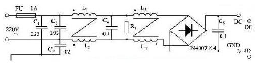 采用無(wú)源的EMI濾波器是抑制傳導(dǎo)干擾最有效的辦法。即在電路中插入一個(gè)帶通濾波器,讓50 Hz交流電暢通,其余頻率的信號(hào)受阻。但要嚴(yán)格控制濾波器LC元件的寄生參數(shù),它們的制作工藝、安裝位置、走線方式,都會(huì)影響EMI濾波效果。加接圖1所示的濾波電路,可以控制通過(guò)傳導(dǎo)耦合進(jìn)入電網(wǎng)的噪聲電平。