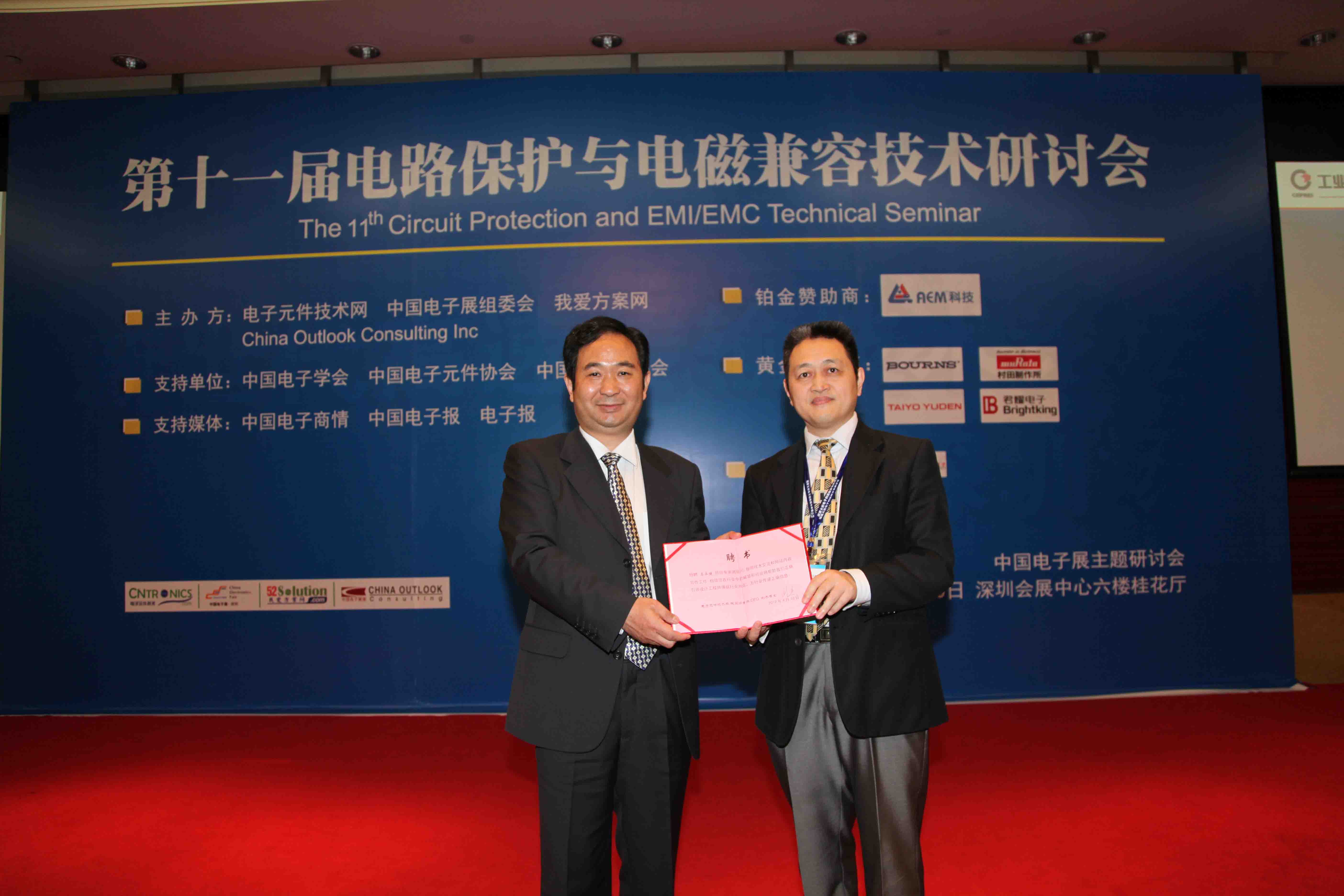 由電子元件技術(shù)網(wǎng)(www.youbw.com)攜手中國(guó)電子展、我愛(ài)方案網(wǎng)(www.52solution.com)和China outlook consulting主辦的第十一屆新電路保護(hù)與電磁兼容技術(shù)研討會(huì)于4月10日在深圳會(huì)展中心六樓水仙廳勝利召開(kāi)!