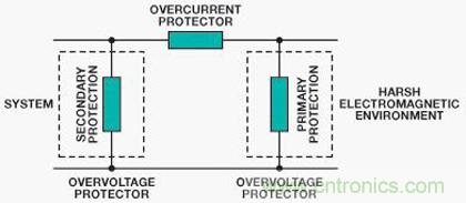 圖5顯示一個典型保護(hù)方案,其特征是具有兩重保護(hù):主保護(hù)和次級保護(hù)。主保護(hù)可將大部分瞬變能量從系統(tǒng)轉(zhuǎn)移開,通常位于系統(tǒng)和環(huán)境之間的接口。它旨在將瞬變分流至地,從而消除大部分能量。