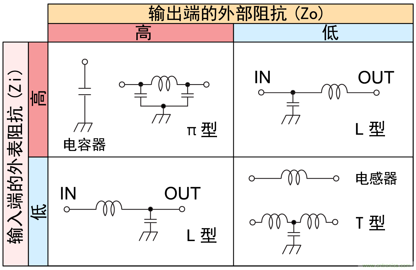 另 一方面,電感器具有所謂的用高阻抗使高頻噪聲反彈的作用,因此電感器與高阻抗部分相接則效果差,反之與低阻抗的電路相接則效果好?此原理歸納于圖2中?圖 中顯示了輸入端阻抗和輸出端阻抗的高低和該條件下噪聲除去效果好的濾波器結(jié)構(gòu)?從圖中可以看出,對(duì)于L型濾波器這類(lèi)不具有對(duì)稱結(jié)構(gòu)的濾波器,若輸入輸出端 接反,則效果發(fā)生變化?使用時(shí)應(yīng)加以注意?