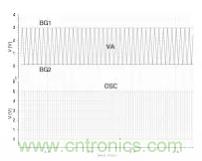 由圖1可以看出,頻率抖動振蕩器由一個(gè)張弛振蕩器加上一個(gè)頻率抖動模塊構(gòu)成。其工作原理:首先,開關(guān) S1閉合,電流源 I0給電容 Cc充電,充電剛開始時(shí)電容 Cc上極板的電壓小于 BG1和 BG2,RS 觸發(fā)器的輸出被置為低電平 0,當(dāng)電容上極板電壓 VA大于 BG2時(shí),RS 觸發(fā)器的輸出狀態(tài)處于保持狀態(tài),直到上極板電壓 VA大于 BG1之后 RS 觸發(fā)器的輸出翻轉(zhuǎn)被置為高電平1;此時(shí),開關(guān) S2導(dǎo)通,電流源 I1給電容Cc放電,當(dāng)VA減小到小于 BG1時(shí),RS 觸發(fā)器的輸出處于保持狀態(tài),當(dāng)VA減小到小于 BG2時(shí),RS 觸發(fā)器翻轉(zhuǎn)被置為低電平 0 ;于是,開關(guān) S1又閉合開始對 Cc充電,如此周而復(fù)始,得到一個(gè)頻率固定的振蕩器。圖1中的電流源I0、 I1的電流相等,則振蕩器的占空比為 0.5。頻率抖動控制模塊是通過計(jì)數(shù)器來周期性的切換加入到張弛振蕩器中充放電電容的大小,改變電壓 VA的充放電速度,從而來達(dá)到周期性的改變振蕩器頻率的目的,即實(shí)現(xiàn)了振蕩器頻率的抖動。