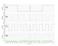 頻率抖動模塊的輸出仿真波形如圖 5 所示,計(jì)數(shù)器 K0,K1,K2,K4實(shí)現(xiàn)了加減法交替功能,從而周期性頻率抖動振蕩器的振蕩頻率為平穩(wěn)的完成周期性的變化。