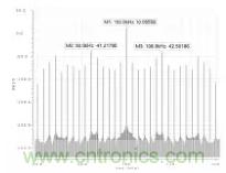 圖 6、圖 7 分別為對不加頻率抖動和加了頻率抖動進(jìn)行傅里葉分析的頻譜圖,對比圖 6 和圖 7 可以看出加了頻率抖動電路之后在固定頻率處的頻譜幅值下降了大約11 dB,由此可見頻率抖動電路對減小 EMI 的效果非常明顯。