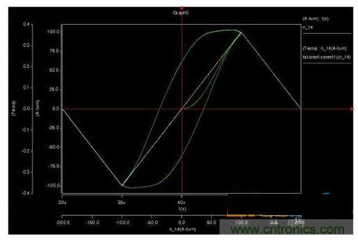 2、仿真CCM模式,磁滯回線上會出現(xiàn)兩個安匝跳變位置,但是磁通密度并不能跳變,而是通過下降來釋放能量。