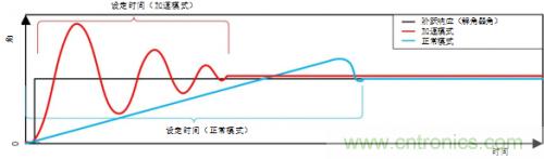 當(dāng)旋轉(zhuǎn)變壓器的電機(jī)位置或輸出信號變化迅速時,穩(wěn)定時間是RDC控制系統(tǒng)的快速性能指標(biāo)[2]。圖1顯示的一個是有階躍輸入變化(黑線)的RDC反饋控制系統(tǒng)的穩(wěn)定時間的例子。藍(lán)色信號顯示的是對電路的正常模式響應(yīng),紅色信號顯示的是加速模式過程中響應(yīng)(角快速變化)。為了在快速變化的條件下追蹤到旋轉(zhuǎn)角,加速模式幫助控制回路很容易跟蹤到一個快速的旋轉(zhuǎn)角[4]。