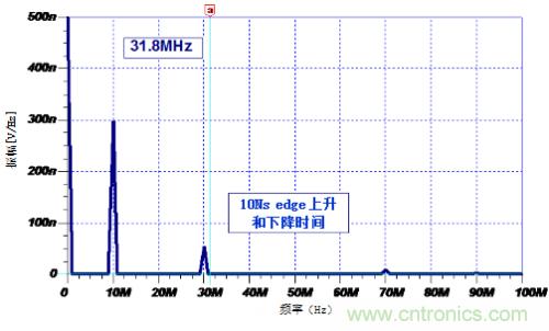 根據(jù)該公式,10nsEdge Rate對應(yīng)的諧波頻率大約為31.8MHz。圖3顯示:最后一個重要的諧波頻率為30MHZ。同時,1ns的Edge Rate對應(yīng)的諧波頻率318MHZ(圖2)。如果頻率范圍擴(kuò)展到300MHZ以外,顯示的諧波仍很明顯,但卻在相關(guān)頻率上迅速變小。