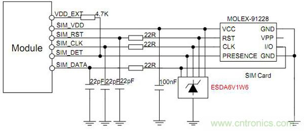 這個(gè)模塊集成2個(gè)SIM卡,所以推薦一種器件能同時(shí)保護(hù)6路信號(hào)的集成ESD器件。