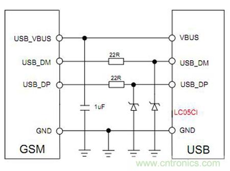 此模塊USB經(jīng)常用來(lái)配置數(shù)據(jù),插拔容易被靜電損壞,本方案可以采用分立器件或者集成器件,但要確保選擇的器件結(jié)電容小于3PF。