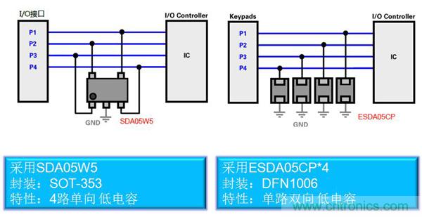 對(duì)于普通的IO口的靜電防護(hù),因?yàn)槠渌俾瘦^低,采用普通的TVS器件即可滿(mǎn)足8KV的防護(hù)需求。