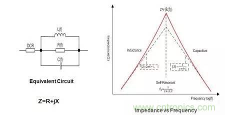 從等效電路中可以看到,當頻率低于fL(LC諧振頻率)時,磁珠呈現(xiàn)電感特性;當頻率等于fL時,磁珠是一個純電阻,此時磁珠的阻抗(impedance)最大;當頻率高于諧振頻率點fL時,磁珠則呈現(xiàn)電容特性。EMI選用磁珠的原則就是磁珠的阻抗在EMI噪聲頻率處最大。比如如果EMI噪聲的最大值在200MHz,那你選擇的時候就要看磁珠的特性曲線,其阻抗的最大值應該在200MHz左右。下圖是一個磁珠的實際的特性曲線圖。大家可以看到這個磁珠的峰值點出現(xiàn)在1GHz左右。在峰點時,阻抗(Z)曲線的值與電阻(R)的相等。也就是說這個磁珠在1GHz時,是個純電阻,而且阻抗值最大。