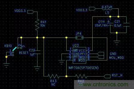 本人有一次對整機(jī)EMC整改,ESD試驗(yàn)時(shí),按鍵控制板的MCU老是復(fù)位。后來用示波器進(jìn)行追蹤,發(fā)現(xiàn)是外部看門狗芯片發(fā)生復(fù)位,導(dǎo)致MCU復(fù)位。于是先在電源上并接TVS管,還是會(huì)復(fù)位;再在看門狗芯片VCC管腳旁并接22uF鉭電容,情況好一些,但還是會(huì)復(fù)位;最后再串接一個(gè)0.47uH的貼片電容,組成LC濾波(如圖3.1所示)。在+-6KV的ESD接觸放電下,就再也不會(huì)復(fù)位,而且工作正常。