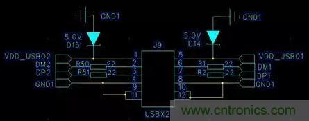 特別是對于裸露在外的一些接口,比如USB、VGA、DC、SD卡等,對這些接口進(jìn)行接觸放電時(shí),靜電很容易就會(huì)“串”到電源線上,靜電由本來的共模變成了差模,此時(shí)電源上就會(huì)產(chǎn)生一個(gè)很高的尖峰,很多芯片都承受不了,發(fā)生死機(jī),復(fù)位等問題。對于電源VCC的ESD保護(hù),可以并接TVS管來解決。TVS管與穩(wěn)壓二極管很相似,都有一個(gè)額定的電壓,不同的是它的響應(yīng)速度特別快,對靜電有很好的泄放作用。例如對于USB接口(見圖1.1、圖1.2),VCC和外殼地之間并接5V的TVS管。相當(dāng)于把電源和地鉗位在5V以內(nèi),這樣可以有效地把靜電電流導(dǎo)向地,達(dá)到效果很明顯。要注意的是布局布線的時(shí)候,TVS管要盡量靠近接口的位置,TVS的陰極以最近的路徑接到接口的外殼地(如果有的話)。