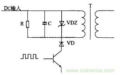 開關(guān)管或 二極管在開通和關(guān)斷過程中,由于存在變壓器漏感和線路電感,二極管存儲電容和分布電容,容易在開關(guān)管集電極、發(fā)射極兩端和二極管上產(chǎn)生尖峰電壓。通常情況下采用RC/RCD吸收回路,RCD浪涌電壓吸收回路如圖2所示。