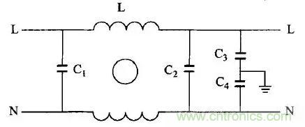 交流電源輸人線上存在以上兩種干擾,通常為低頻段差模干擾和高頻段共模干擾。在一般情況下差模干擾幅度小、頻率低、造成的干擾小;共模干擾幅度大、頻率高, 還可以通過導(dǎo)線產(chǎn)生輻射,造成的干擾較大。若在交流電源輸人端采用適當(dāng)?shù)腅MI濾波器,則可有效地抑制電磁干擾。電源線EMI濾波器基本原理如圖1所示, 其中差模電容C1、C2用來短路差模干擾電流,而中間連線接地電容C3、C4則用來短路共模干擾電流。共模扼流圈是由兩股等粗并且按同方向繞制在一個(gè)磁芯 上的線圈組成。如果兩個(gè)線圈之間的磁藕合非常緊密,那么漏感就會很小,在電源線頻率范圍內(nèi)差模電抗將會變得很小;當(dāng)負(fù)載電流流過共模扼流圈時(shí),串聯(lián)在相線上的線圈所產(chǎn)生的磁力線和串聯(lián)在中線上線圈所產(chǎn)生的磁力線方向相反,它們在磁芯中相互抵消。 因此即使在大負(fù)載電流的情況下,磁芯也不會飽和。而對于共模干擾電流,兩個(gè)線圈產(chǎn)生的磁場是同方向的,會呈現(xiàn)較大電感,從而起到衰減共模干擾信號的作用。 這里共模扼流圈要采用導(dǎo)磁率高、頻率特性較佳的鐵氧體磁性材料。